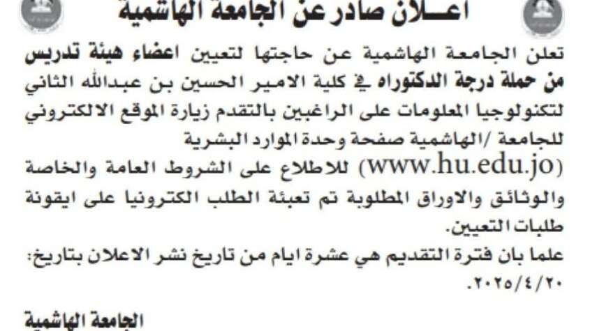 الجامعة الهاشمية بحاجة لتعيين اعضاء هيئة تدريسية