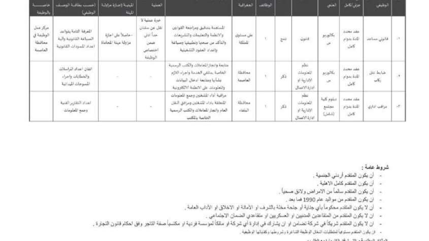 مركز العمل: ضمن محافظة العاصمة المهام والمسؤوليات: المساهمة بتدقيق ومراجعة القوانين والأنظمة والتعليمات والتشريعات، والتأكد من صحتها وتطبيقها، وصياغة المسودات القانونية، وإعداد العقود التشغيلية