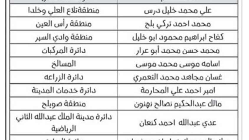 وقالت : “تنذر أمانة عمان الكبرى الموظفين (عمال الوطن) المذكورة أسماؤهم أدناه، المتغيبين عن مراكز عملهم لمدة تزيد عن 10 أيام متتالية دون عذر مشروع، بضرورة العودة إلى عملهم خلال 3 أيام من تاريخ نشر هذا الإعلان، وذلك تجنبا للفصل من العمل، استنادا إلى أحكام الفقرة (هـ) من المادة (28) من قانون العمل رقم (8) لسنة 1996”.