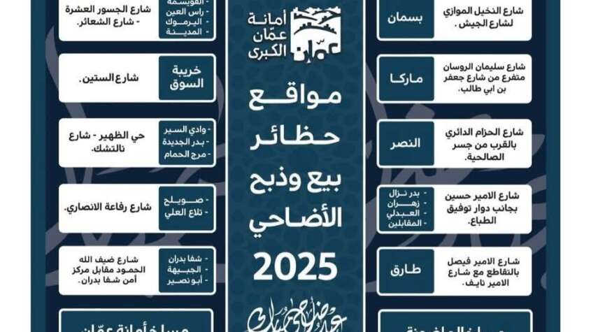 الرؤيا –   أعلنت أمانة عمّان الكبرى عن المواقع المرخصة والمعتمدة لبيع وذبح الأضاحي في العاصمة عمّان خلال موسم عيد الأضحى لعام 2025.