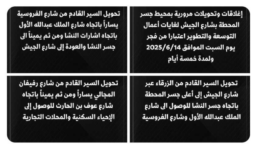الرؤيا – اغلاقات وتحويلات مرورية بمحيط جسر المحطة بشارع الجيش لغايات أعمال التوسعة وتطوير المنطقة اعتبارا من السبت القادم.