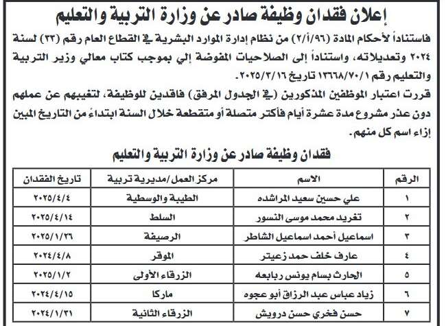 الرؤيا –  أعلنت وزارة التربية والتعليم عن فقدان عدد من الموظفين لوظائفهم، وذلك استنادًا إلى أحكام المادة (96/أ/2) من نظام إدارة الموارد البشرية في القطاع العام رقم (33) لسنة 2024 وتعديلاته، وبموجب الصلاحيات المخولة للوزارة بموجب كتاب رسمي صادر عن الوزير.