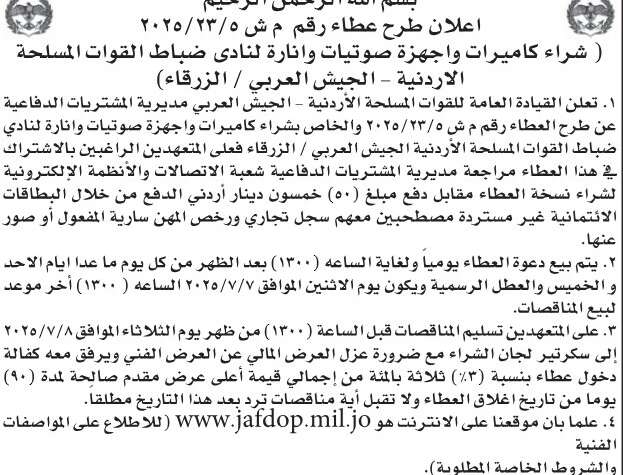 الرؤيا –   أعلنت القيادة العامة للقوات المسلحة الأردنية – الجيش العربي، ممثلة بمديرية المشتريات الدفاعية، عن طرح عطاء جديد رقم (م ش 2025/23/5)، يتضمن شراء كاميرات وأجهزة صوت وإنارة، لصالح نادي ضباط القوات المسلحة الأردنية في محافظة الزرقاء.
