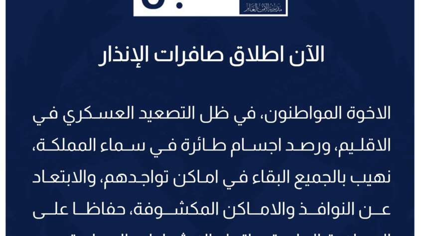 الرؤيا الأن اطلاق صافرات الانذار الاخوة المواطنون، في ظل التصعيد العسكري في الاقليم، ورصد اجسام طائرة في سماء المملكة، نهيب بالجميع البقاء في اماكن تواجدهم، والابتعاد عن النوافذ والاماكن المكشوفة، حفاظا على السلامة العامة، واتباع الإرشادات الصادرة عن الجهات المختصة#الامن_العام #الاردن