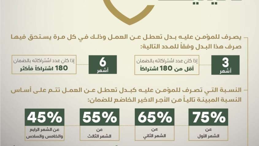 وأوضحت المؤسسة أنه يشترط لاستفادة المؤمن عليه من بدل التعطل عن العمل؛ أن لا تقل عدد اشتراكاته عن 36 اشتراكا بالضمان قبل تاريخ استحقاق بدل التعطل منها اشتراك واحد على الأقل في التأمين من خلال الشمول في منشأة بالقطاع الخاص، وأن لا يكون قد بلغ سن 60 سنة بالنسبة للذكر أو سن 55 سنة بالنسبة للأنثى، وأن يتقدم المؤمن عليه بالطلب المتاح بشكل إلكتروني أثناء تعطله عن العمل.