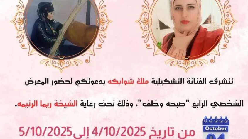 تستعد الفنانة التشكيلية ملك شوابكه لإطلاق معرضها الشخصي الرابع تحت عنوان “صبحه و خلف”، وذلك برعاية الشيخة ريما الزتيمة، في جاليري رأس العين – أمانة عمان الكبرى.
