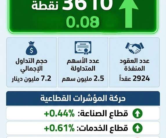 وارتفع الرقم القياسي العام لأسعار الأسهم للإغلاق إلى 3610 نقطة، بارتفاع نسبته 0.08 بالمئة، إذ ارتفع الرقم القياسي في قطاع الخدمات بنسبة 0.61 بالمئة، وفي قطاع الصناعة بنسبة 0.44 بالمئة، بينما انخفض الرقم القياسي في القطاع المالي بنسبة 0.26 بالمئة.