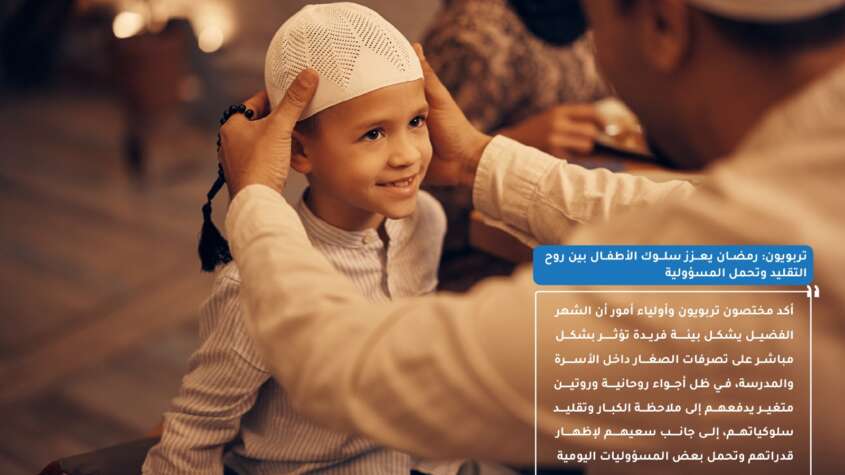 وأشاروا إلى أن رمضان يشكل فرصة تعليمية مهمة لترسيخ قيم الانضباط والتحمل والتعاون، مؤكدين أن التعامل الواعي مع سلوك الأطفال يعزز تطورهم الجسدي والنفسي والاجتماعي، ويغرس لديهم تقدير المعاني الدينية والاجتماعية، ويحول الصيام إلى تجربة إيجابية مستمرة في حياتهم.