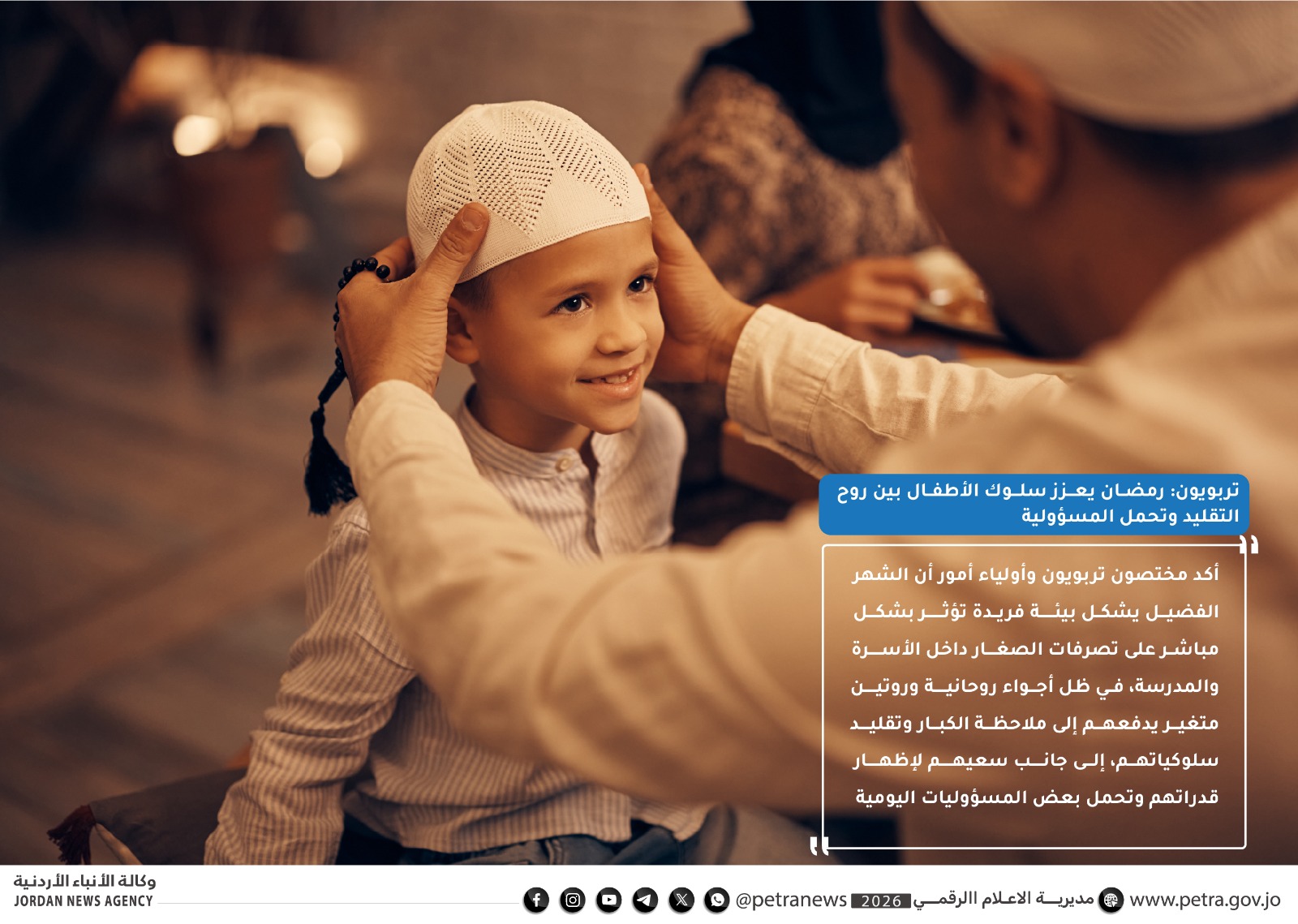 وأشاروا إلى أن رمضان يشكل فرصة تعليمية مهمة لترسيخ قيم الانضباط والتحمل والتعاون، مؤكدين أن التعامل الواعي مع سلوك الأطفال يعزز تطورهم الجسدي والنفسي والاجتماعي، ويغرس لديهم تقدير المعاني الدينية والاجتماعية، ويحول الصيام إلى تجربة إيجابية مستمرة في حياتهم.