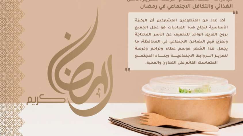 بدورهم، أكد عدد من المتطوعين المشاركين أن الركيزة الأساسية لنجاح هذه المبادرات هو عمل الجميع بروح الفريق الواحد للتخفيف عن الأسر المحتاجة وتعزيز قيم التضامن الاجتماعي في المحافظة، ما يجعل هذا الشهر موسم عطاء وتراحم وفرصة لتعزيز الروابط الاجتماعية وبناء المجتمع المتماسك القائم على التعاون والمحبة.