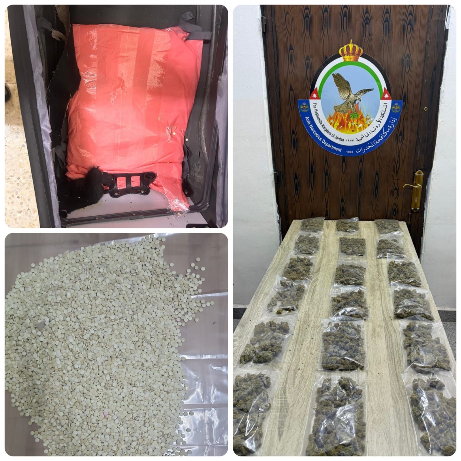 وفي محافظة المفرق وبعد مراقبة وجمع المعلومات عن أحد الأشخاص المشتبه بتورطه بالتعامل مع عصابات إقليمية لتهريب المخدرات والتأكد من نشاطاته الجرمية وحيازته للمواد المخدرة واستخدامه مزرعة في محافظة المفرق لتخزين وبيع تلك المواد، فقد جرت مداهمته وإلقاء القبض عليه وضُبط بحوزته 3 كيلو غرامات من مادّة الكريستال المخدرة و90 كف حشيش و3000 حبّة مخدرة.