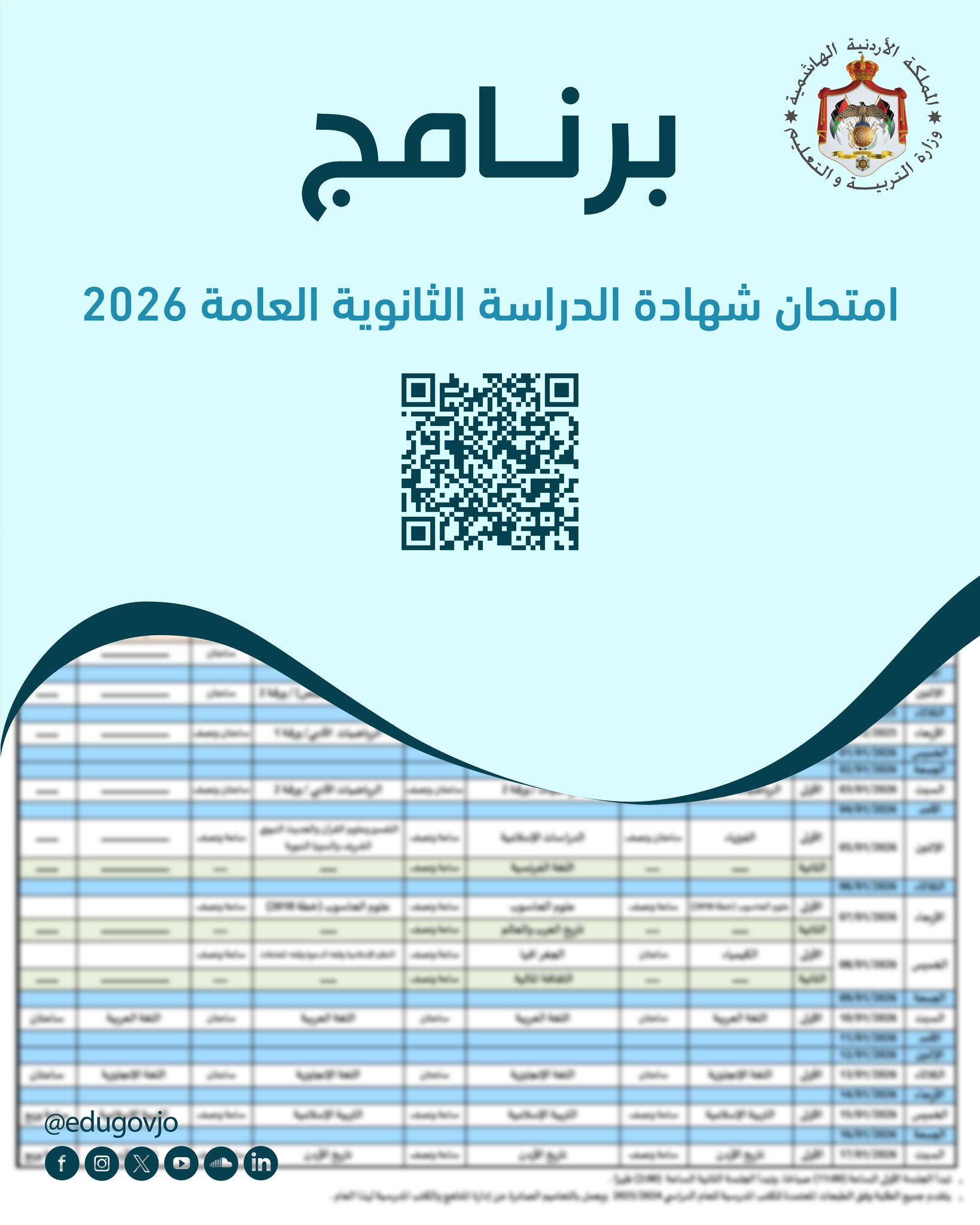 تُعلن الجهات المختصة عن برنامج امتحان شهادة الدراسة الثانوية العامة لعام 2026، حيث ستنطلق الامتحانات بمشيئة الله تعالى يوم الخميس الموافق 25 حزيران 2026، وتستمر حتى يوم السبت الموافق 18 تموز 2026.