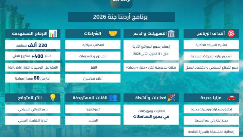 ويهدف البرنامج إلى تنشيط السياحة الداخلية وتشجيع المواطنين على استكشاف الوجهات السياحية بالمملكة، من خلال تقديم تجارب سياحية متنوعة وبأسعار مدعومة تناسب مختلف الفئات، ويستهدف الوصول إلى نحو 220 ألف مستفيد خلال عام 2026، مع التركيز على زيادة الرحلات إلى الوجهات الأقل زيارة، ودعم المناطق الأكثر تضرراً من نقص أعداد الزوار جراء الأحداث الإقليمية الراهنة، وخاصة مدينة البترا.