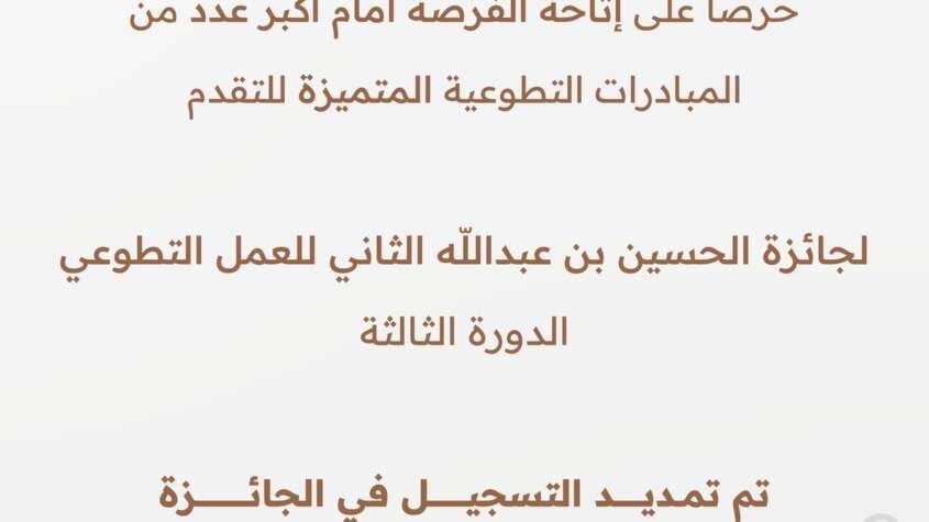 ويأتي تمديد التسجيل في الجائزة بهدف إتاحة الفرصة أمام العدد الأكبر من أصحاب المبادرات التطوعية للتسجيل في الجائزة، فضلاً عن منح فرصة إضافية للمتقدمين لاستكمال متطلبات التقدم للجائزة.