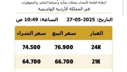 الرؤيا – انخفضت أسعار الذهب محليا، اليوم الثلاثاء، 80 قرشا للغرام، وفق نقابة الحلي والمجوهرات.…
