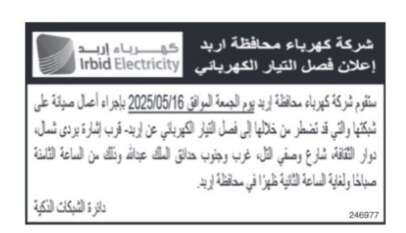 الرؤيا – أعلنت شركة كهرباء محافظة إربد عن نيتها إجراء أعمال صيانة مبرمجة على شبكتها…