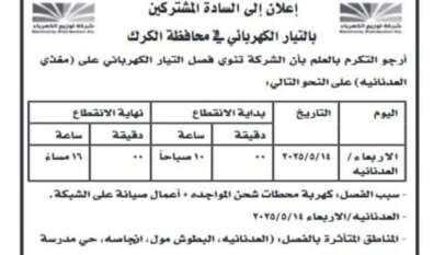 انقطاع التيار الكهربائي عن هذه المناطق الأربعاء القادم