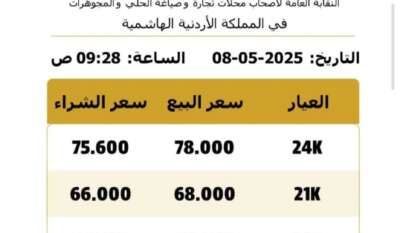 الرؤيا – انخفضت أسعار الذهب محليا، اليوم الخميس، دينار واحد للغرام، وفق نقابة الحلي…