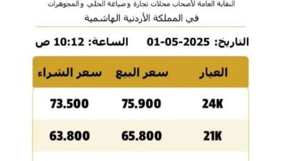 الرؤيا – انخفضت أسعار الذهب محليا، اليوم الخميس، 160 قرشا للغرام، وفق نقابة الحلي…