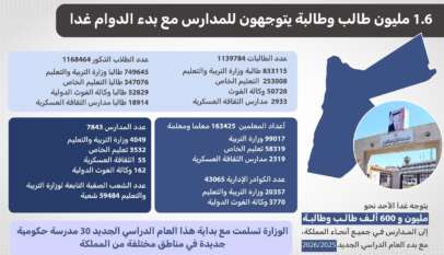 - 1.6 مليون طالب وطالبة يتوجهون للمدارس مع بدء الدوام غداً- الرؤيا الإخبارية:- يتوجه غداً الأحد نحو مليون و 600 ألف طالب وطالبة إلى المدارس في جميع أنحاء المملكة، مع بدء العام الدراسي الجديد 2025/2026.وأوضحت وزارة التربية والتعليم، أن أعداد الطلاب في المدارس الحكومية قابلة للزيادة أو النقصان، لاسيما أن ذلك مرتبط بالانتقال والتسجيل مع بداية دوام المدارس المقرر غداً.وأعلنت الوزارة… أكمل القراءة »