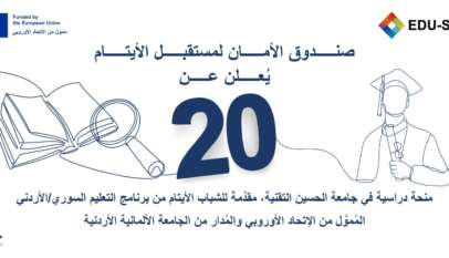 الرؤيا الإخبارية:- أعلن صندوق الأمان لمستقبل الأيتام اليوم الاثنين، عن تمديد فترة التقديم على المنح الدراسية التي أعلن عنها سابقا، لغاية الثلاثاء 26 آب الحالي.وأشار الصندوق إلى أن عدد المنح بلغ 20 منحة دراسية ممولة بالكامل من برنامج التعليم السوري/ الأردني EDU-SYRIA الممول من الاتحاد الأوروبي EU و المدار من…
