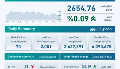 2025-06-17 الرؤيا – أغلقت بورصة عمان تداولاتها اليوم الثلاثاء، على ارتفاع نسبته 0.09 بالمئة الى مستوى النقطة 2654، حيث بلغت الأسهم المتداولة 2.4 مليون سهم بقيمة 6 ملايين دينار نتيجة تنفيذ 2051 صفقة. ولدى مقارنة أسعار الإغلاق للشركات المتداولة أسهمها، تبين أن 25 شركة أظهرت انخفاضا بأسعار أسهمها، بينما ارتفعت…