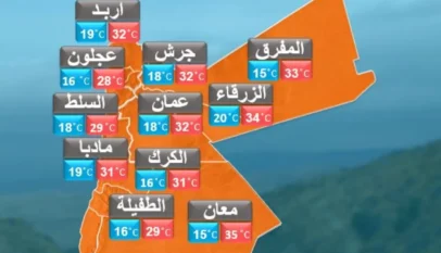 2025-06-18 الرؤيا – يطرأ اليوم الأربعاء، ارتفاع قليل على درجات الحرارة، ويتوقع أن تسجل أعلى من معدلاتها لمثل هذا الوقت من السنة بنحو 2-3 درجات مئوية،حيث يكون الطقس حارا نسبيا في أغلب المناطق، وحارا في البادية والأغوار والبحر الميت والعقبة، وتكون الرياح شمالية غربية معتدلة السرعة تنشط احيانا خاصة في…